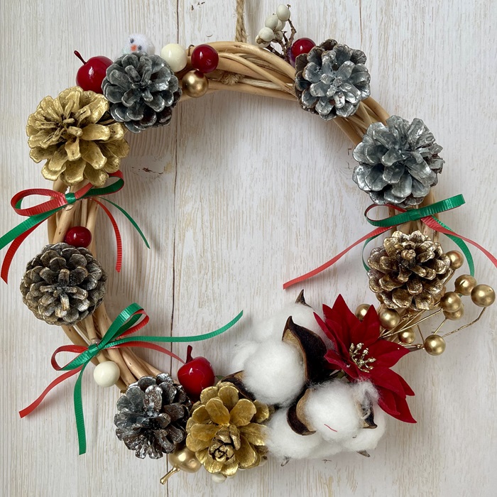 八景島で収穫した松ぼっくりを使ったXmasのインテリアです
